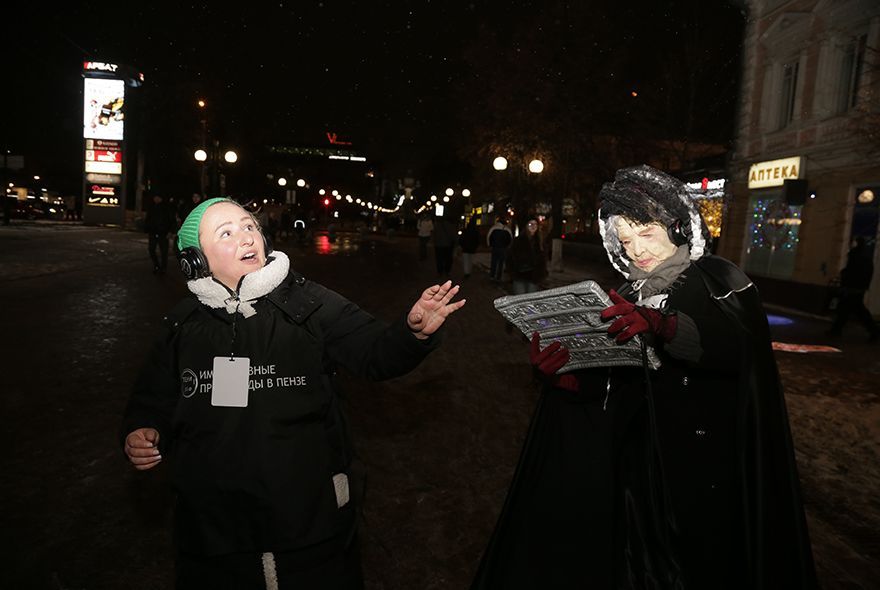 Новую экскурсию с погружением поставил режиссер Павел Тачков по сценарию Ларисы Трушиной. Павел принял участие и в озвучивании. Также зрители, гуляющие по городу в наушниках, слышат в них голоса народной артистки России Галины Репной, заслуженной артистки Пензенской области Марты Серебряковой, актера драмтеатра Альберта Ибраева. Автор нескольких музыкальных композиций – Герман Гуляев. Ну а проводниками по вечерней Пензе вновь стали Ольга Белугина и Елизавета Коплун.