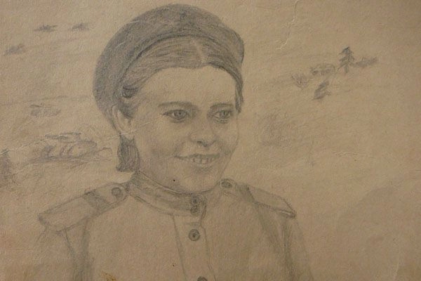 Женщина рассказала, это портрет ее бабушки Любови Колокольцевой умершей в 60-х годах. Перед отправкой на фронт она окончила краткосрочные медсестринские курсы в Наровчате и была отправлена в Сталинград. Видимо там и был сделан это карандашный набросок. Кто был его автором неизвестно, но по качеству исполнения рисунок выполнен очень профессионально.