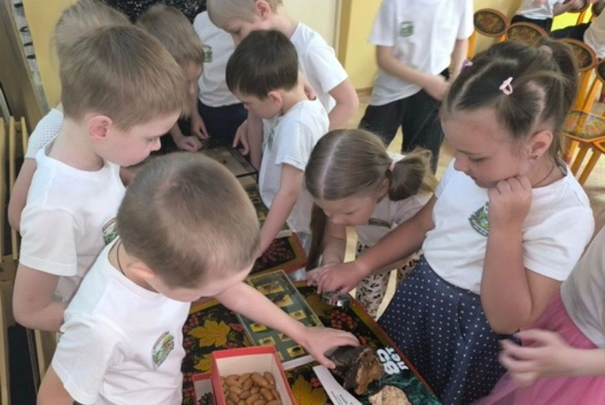На занятии дети увидели экспонаты из рабочих коллекций: образцы насекомых‑вредителей леса; трутовики — древесные грибы, сигнализирующие о болезни деревьев; шишки ели и сосны с семенами.