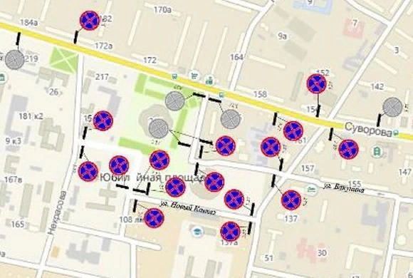 С 6 утра и до полуночи 9 мая 2019 движение авто прекращается в районе на Юбилейной площади. Это касается дорог по ул. Бакунина (на участке от ул. Толстого до ул. Суворова) и по ул. Новый Кавказ (на участке от ул. Толстого до ул. Пугачева).