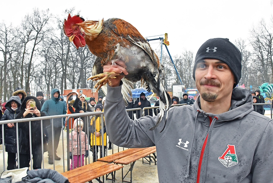 Аттракцион «Достань петуха» из-за капризов погоды решили не отменять. Правда, петух в качестве приза был всего один. И достался он Вячеславу Дегтеву — тренеру по тайскому боксу из Пензы, который первым добрался до верхотуры. Спортивная подготовка помогла. Ведь покорить мокрый, скользкий, обледеневающий на ветру столб, было очень трудно.