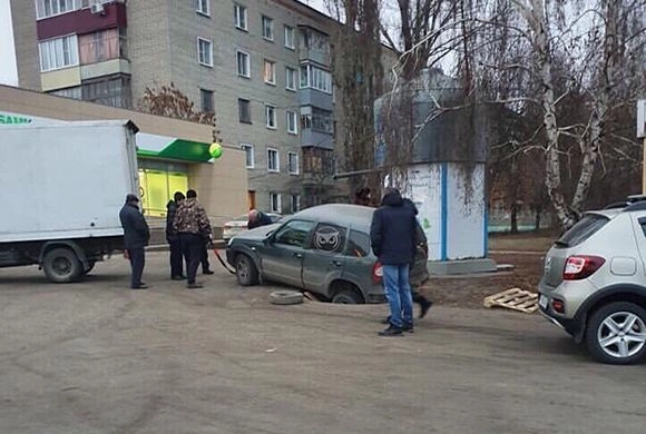 В Пензе на ул. Аустрина Niva провалилась в колодец