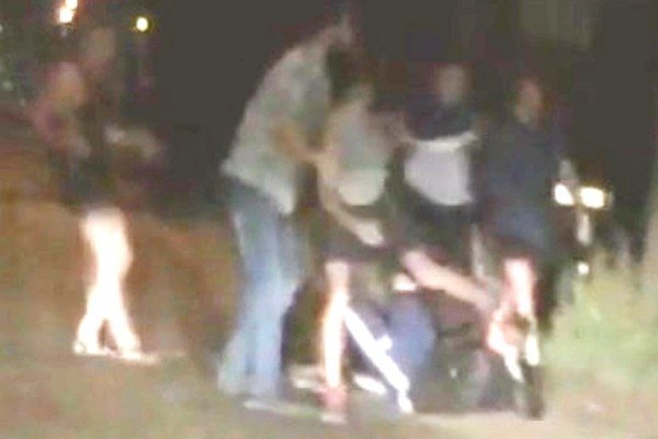 На записи видно как пятеро или шестеро молодых людей избивают ногами лежащего на земле человека. Причина конфликта осталась за кадром.