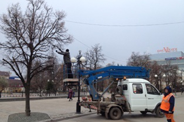 Как сообщает пресс-служба городской администрации, с помощью двух единиц техники сотрудники районной администрации украсили новогодней атрибутикой более 20 деревьев.