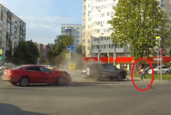 В начале 19-секундного ролика видно, как красная иномарка, двигаясь по средней полосе по ул. Ставского начинает движение на зеленый свет. В этот момент в легковушку врезался мчащийся по ул. Пушкина кроссовер. После удара последний вылетел на тротуар, на котором находилась девушка-пешеход. К счастью, ей удалось отпрыгнуть.