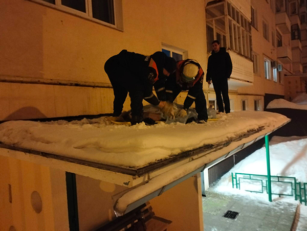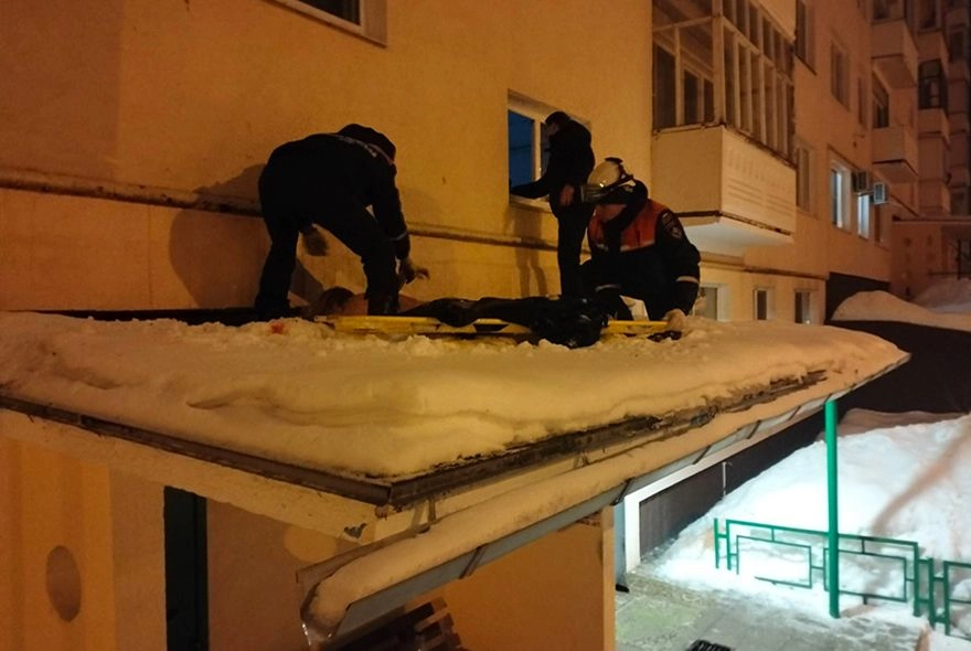 Спасатели поднялись на козырек подъезда, уложили тело погибшей на носилки, спустили вниз и передали сотрудникам полиции.
