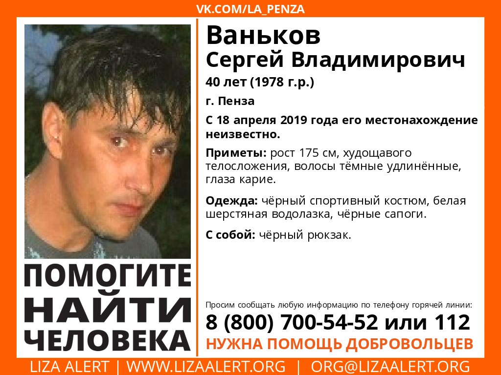 Приметы Сергея Ванькова: рост 175 см, худощавого телосложения, волосы темные удлиненные, глаза карие. Был одет в черный спортивный костюм, шерстяную водолазку и черные сапоги. С собой у мужчины был рюкзак.